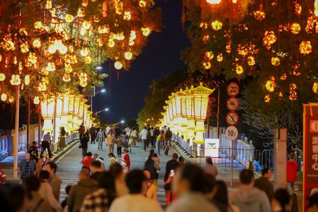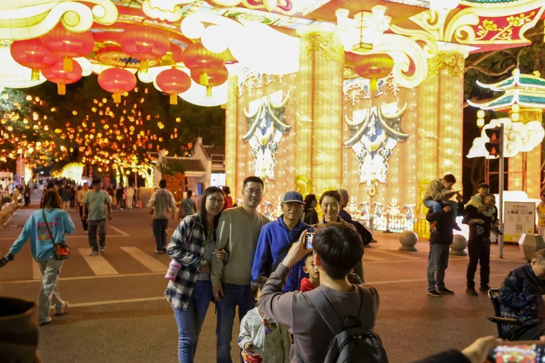 当夜幕降临,万盏花灯一一点亮,2.5千米的主游线路瞬间化作璀璨星河,如梦似幻。英歌舞开道、舞龙舞狮舞麒麟送祥瑞……大年初一灯会好戏连台,非遗表演轮番上阵,氛围直接拉满。来自各地的游客络绎不绝,一家老小漫步灯海之中,赏灯、拍照打卡,处处洋溢着团圆喜乐的氛围。