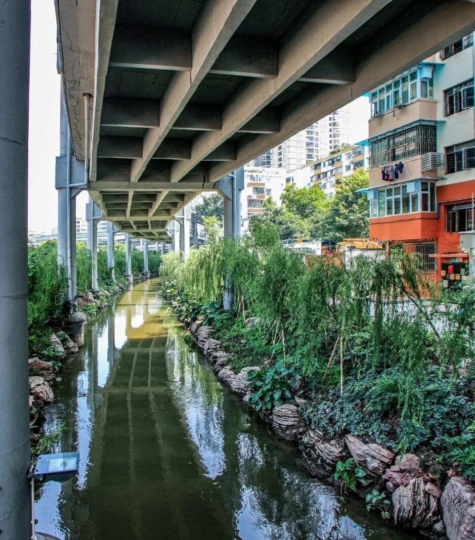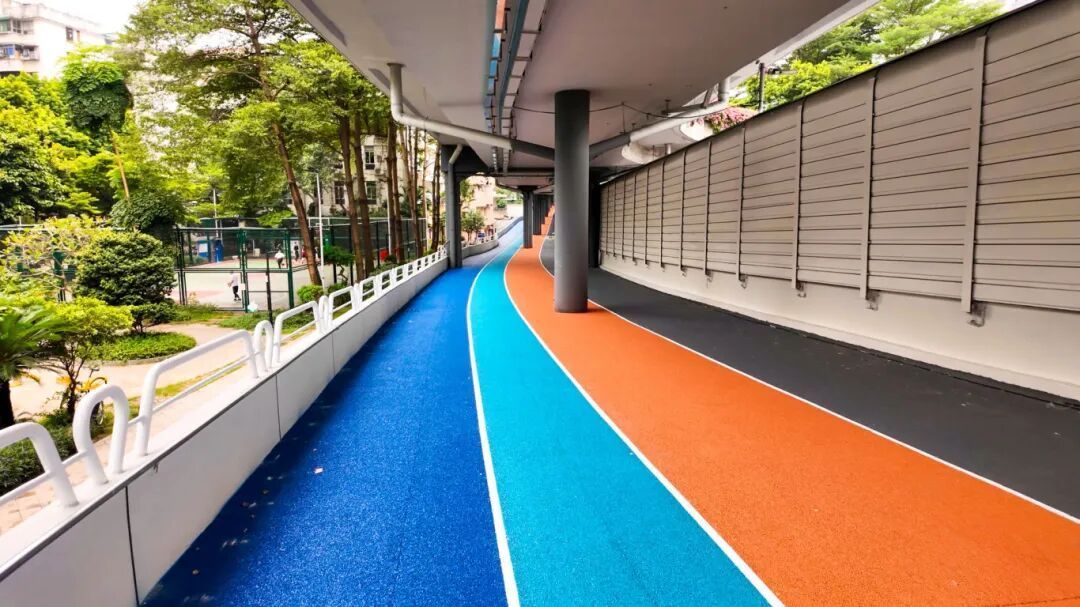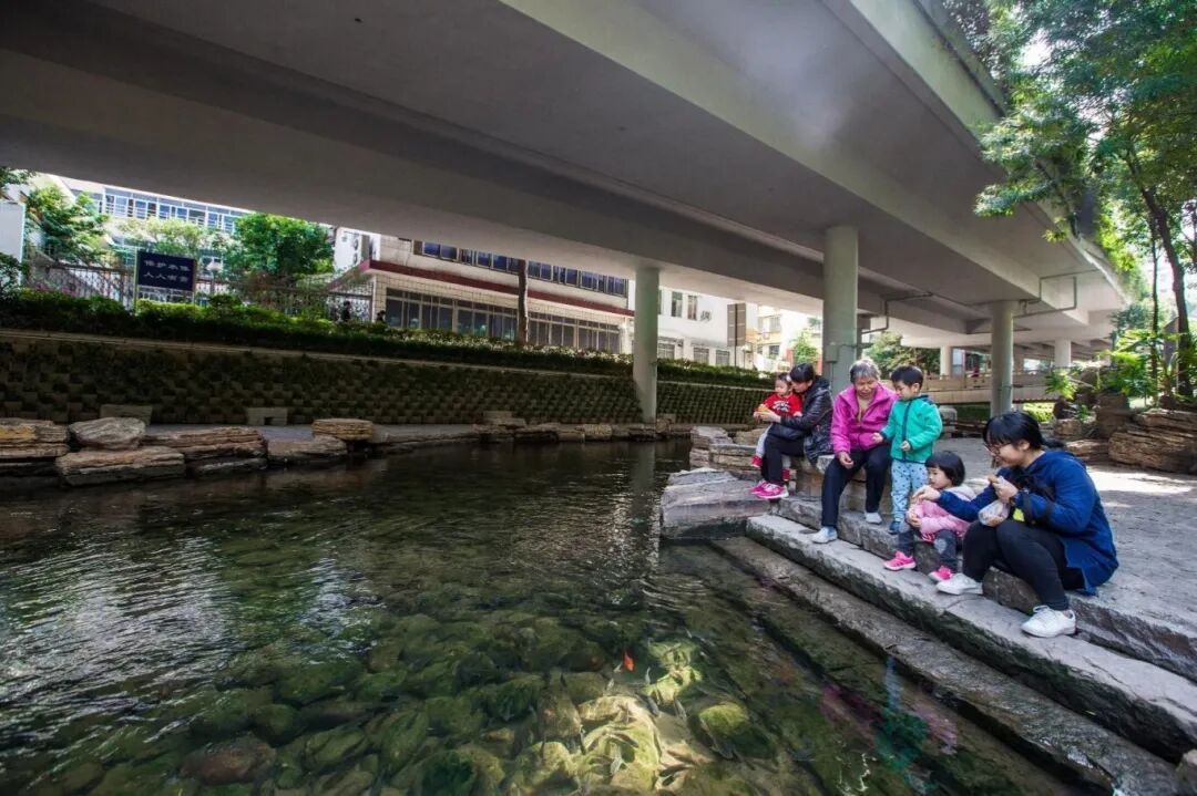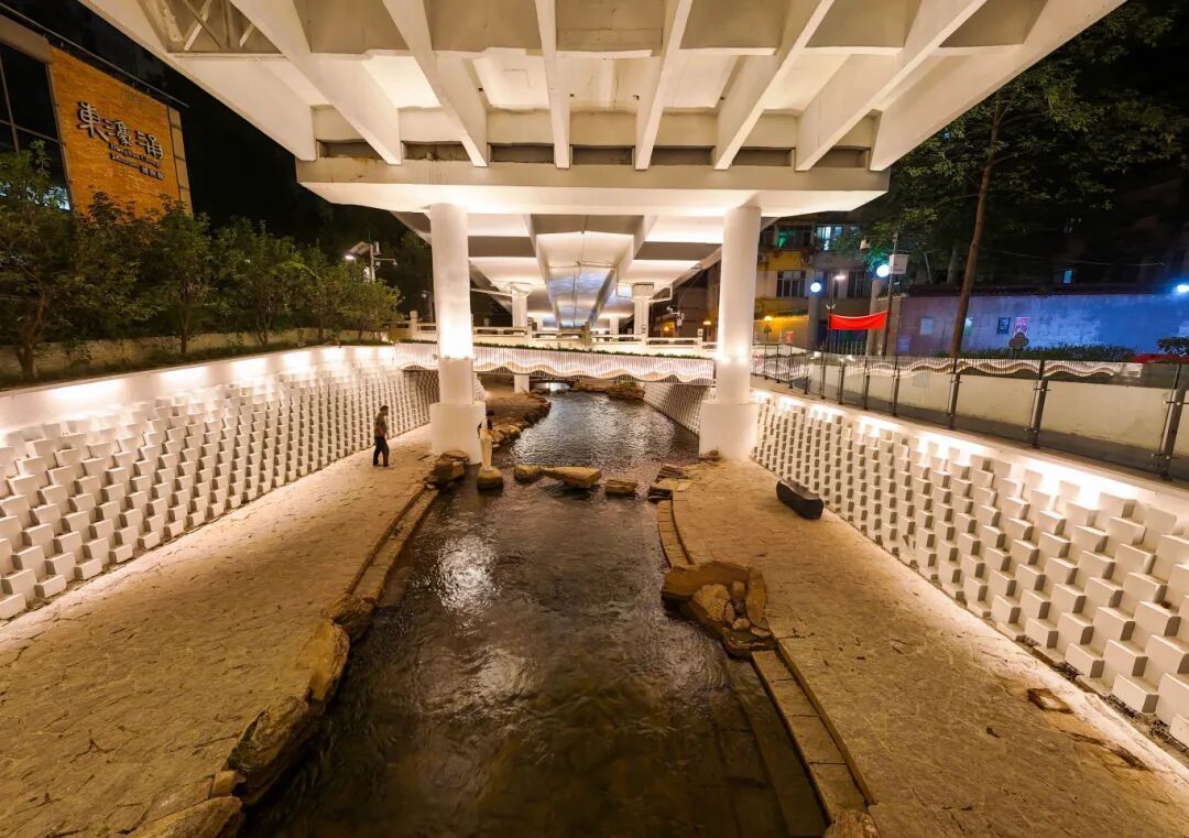 利用边角地、闲置地打造口袋公园、休憩平台;在涌边增设坐凳,点亮夜景灯光;甚至将高架桥下空间改造为全长约1公里的彩色跑道,供居民散步健身。