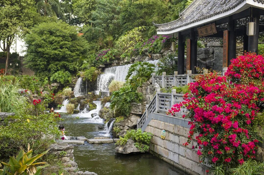 岸边石阶旁点缀肾蕨、龟背竹,散落的景石半掩于花土之中,低矮灌木环绕四周,层次丰富,野趣盎然。